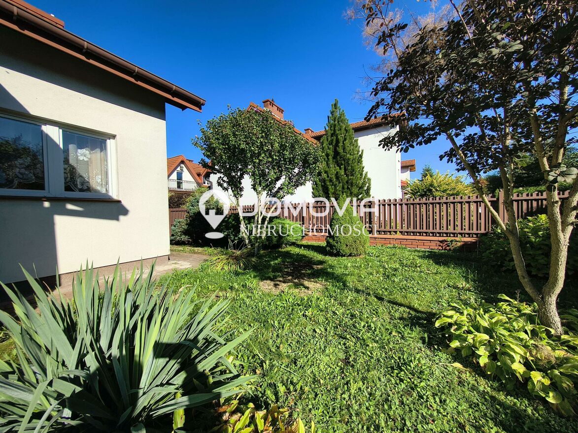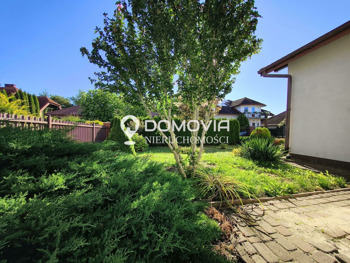 Działka o powierzchni 350 m jest zadbana i estetycznie zagospodarowana częściowo obsadzona roślinnością ozdobną i trawnikiem, a częściowo wyłożona kostką brukową (podjazd i dojścia z odwodnieniem) ogrodzona.